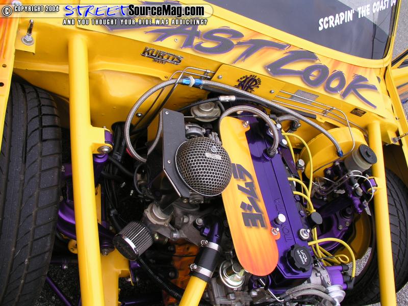 The engine cage extends throughout the firewall, and joins the frame. Notice the handmade brackets that replace the need for a core support. The front end was to look like a race ready spec truck. This truck was built when the first Nastrucks were appearing at exhibitions, they wanted the mini to look the same way. Notice the carbon fiber valance below the window.