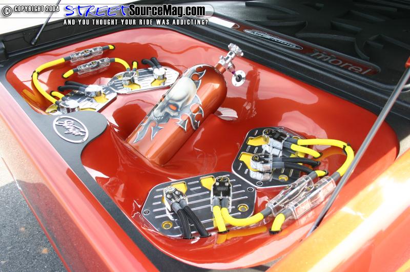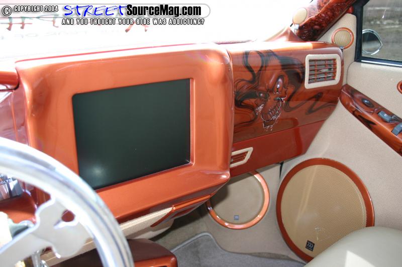The interior of Bobby’s truck was all smoothed and glassed. The interior also features HOK painted parts with custom graphics. Bobby’s interior features everything from a custom stereo, chrome fire extinguishers, billet steering wheel, to custom wrapped seats.
