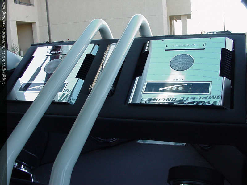 To accompany the custom interior now at hand, Darron took it upon himself to install a bad ass stereo to tie the entire interior together. Starting with an in-dash Pioneer Premier head-unit along with a Cadence EQ,, the tunes would be provided throughout. Next, Darron built his amp rack, which houses three chrome Audiobahn 2600 2-channel amplifiers and 1 chrome Audiobahn 2400 2-channel amplifier. Not only housing the amplifiers, the rack also displays the chrome Audiobahn Acap1 farad caps.