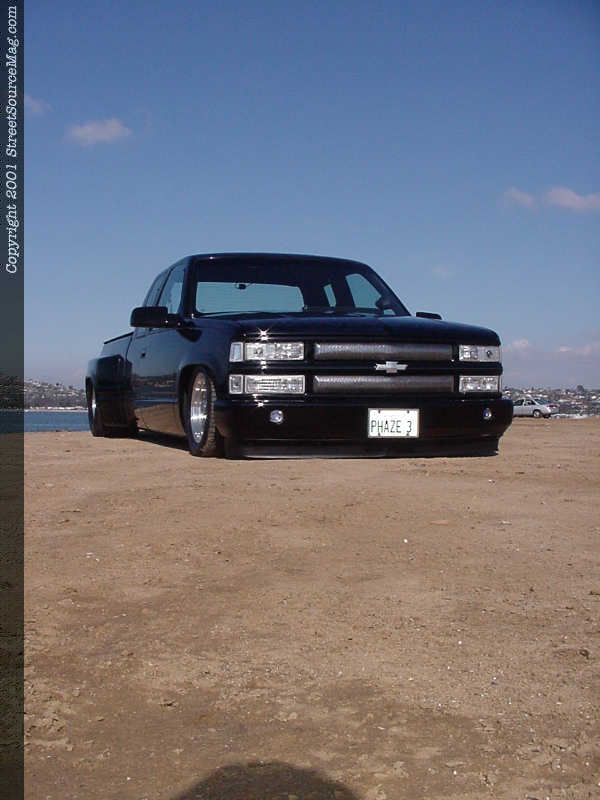 Now finding the Silverado laying flat, it was time to change up the look of the body. Starting with the front, Soupy replaced the grille with a '95 grille fixed with an A&Z mesh insert. The stock headlights were ditched and replaced with APC projector lamps and a CATZ zeta system. Working his way to the rear would take some skilled work, which was left up to Larry "Bones" Llmas of Goleta, California. To start off his work at hand, Larry began by bolting up a custom front bumper from Sir Michaels. Next, Larry filled all the seams behind the cab.