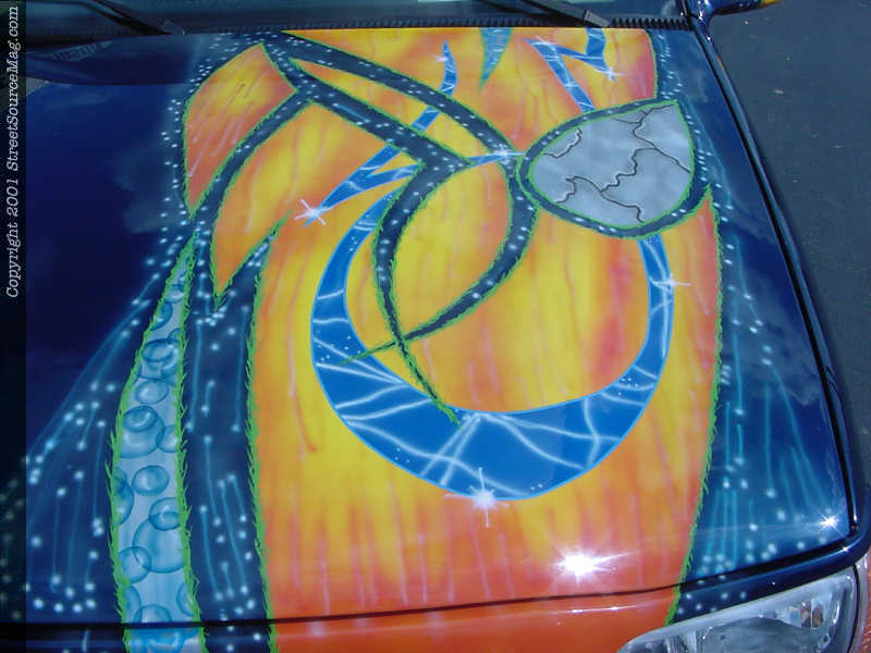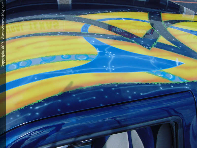 Now with his ride hugging mother earth and shaved out, it was time to hand over the rains to Clark Barker to apply his wealth of paint knowledge to this beast of a ride. To start things off, Clark would go over the truck making sure it was prepped to perfection and block one last time before adding the paint. After being satisfied with what he had to work with, it was time to add the PPG paint that Jim had requested. The base color that Clark would first apply was Indigo blue. After applying many coats, Clark then tested his hand at applying graphics to Jim's ride.  Once the final graphics were sprayed, the truck was cleared, cut and buffed. This gave Jim a warm fuzzy feeling inside.