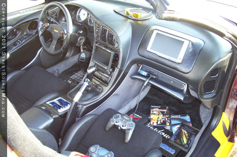 The once empty glove box was motorized and a Sony PS2 game system was added. Moving to what once used to be the rear seating area Gary used Phoenix Gold amps to power the three 10" JL Audio subs and the Diamond Audio highs that were used in the front and the rear of the topless racer. To make sure Gary's prize possession stayed put once it was parked he had an Alpine alarm added. Well whoever said the first time is a charm must have known all about Gary's Spyder. I guess I forgot to mention that Gary is not your normal teenage racer; you see during the two-year process of the car being built, Gary turned 50 years young. And by the way this isn't a trailer queen either, Gary's wife says he drives the car at least 3 times a week. Boy is he brave. Gary would like to thank Autopro for all the hard, long hours of perfection, his sister Kathy, JR Electronics and the most important person in his life, his wife Audrey. I guess when you invest six figures in an Eclipse Spyder you leave the other guys "In The Shadows".