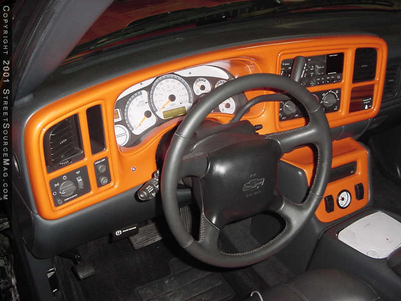 Turning the focus to the interior, Chad relied on his own shop, Trikin' Out Truks to get the ball rolling and change the boring factory interior to something any judge could admire. First, the dash face was removed and painted the same House Of Kolor orange as the exterior.   The center console and several door panels were also removed and painted using the same orange, before being reinstalled. The door panels were wrapped in gray leather as well as the headliner.