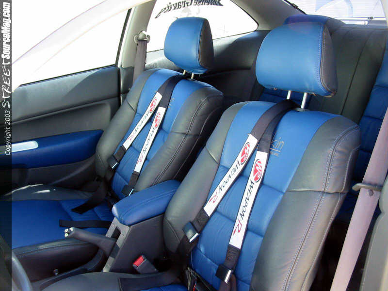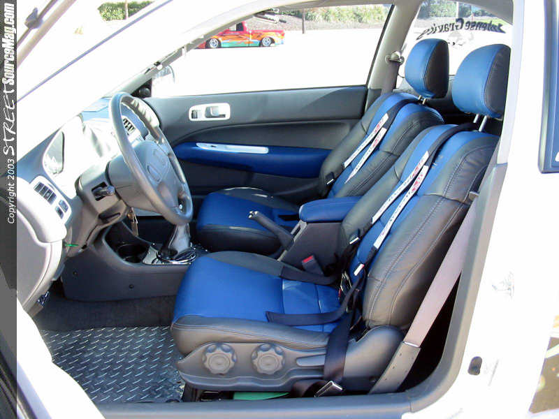 He then ordered up a touring view rear view mirror, toucan shifter cover, stainless shifter housing, Type R shift knob diamond plate floor mats, and street glow interior strobe lights.   After he installed all of his new parts, it was time to do something with the stock upholstery. Katskinz was called upon to help with this task.