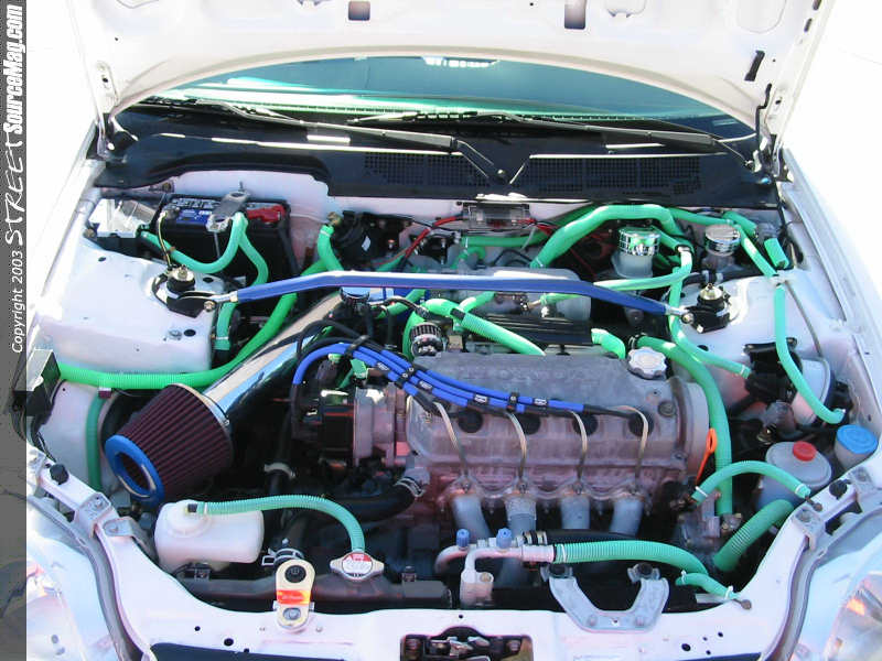 Corey' philosophy on racing an import is simple, "Its a show car not a race car, your not moving when your showing". Even though he doesn't believe in racing his Honda, he couldn't just leave the engine bay stock. He bolted up an OBX type r short ram chrome intake with a K&N air filter, chrome covers and brackets for misc engine compartment items, and lime green wire loom to hide the not so pretty factory wiring.  Next was a DC sports 4:2:1 1 piece ceramic coated header, attached to a 2 1/2" exhaust system, that also has a chrome finish.