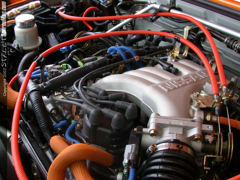 Nearly complete the engine was last on the long list of must do's. For starters a Stillen Intake, STR carbon fiber and polished dress up pieces along with orange and blue silicon hoses and wire covers would be installed. Next Nathan would install a 2-½ inch Gibson tri-flow cat witch dumps off before the rear axle, which had been custom bent. Finishing things off, the ignition system is computer chipped and the vehicle is traced by GPS for the alarm system, not a bad touch for this spendy completion.
