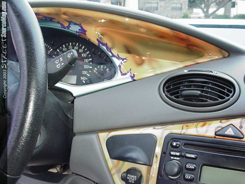 The seats were first re-stitched, complete withcheetah accents. The floor and kick panels were thenrewrapped using tan and cream suede. The rear hatchalso received a makeover, as the panels were wrapped in matching tan and cream suede.  The dash panels were also color matched to the outside of the car, receiving paint and graphics. One can also find billet window cranks.