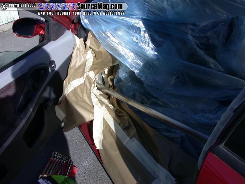 Start off by taking the seats and any other interior piece that will hinder your ability to get around the pieces you are painting. In our case we took out the seats since the come in contact with the cage. Then mask off the entire interior so you don't get overspray. This is the most important yet difficult and time-consuming part of the process. If you mess up and leave areas exposed then you will not be happy with the results!