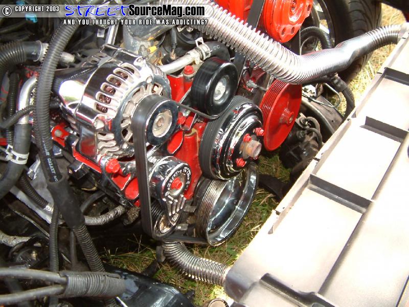 With one item untouched, Chas needed to dig into the stock 305 and give it some good eye candy. Chas would find the 305 already equipped with an upgraded crankshaft and new rods. The water pump would be powder coated along with having the alternator and engine pulley's chrome plated. An electric cooling fan would be installed to help cool things down. With a leaking exhaust, Chas would make sure his Flowmaster muffler would still keep his 305 sounding mean.