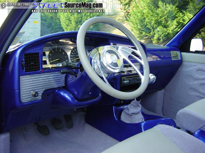 Now that the outside was something that would catch everyone's eye, it was time to completely redo the interior. The factory seat was taken out in favor of some out of a Honda Prelude, but not before they were reshaped and rewrapped in lilac tweed and gray all ante.   Bubba even had the Pebble Pusher logo stitched into the headrest. The door panels were shaved of all extrusions (arm rests, window cranks, door handles) to smooth it out.
