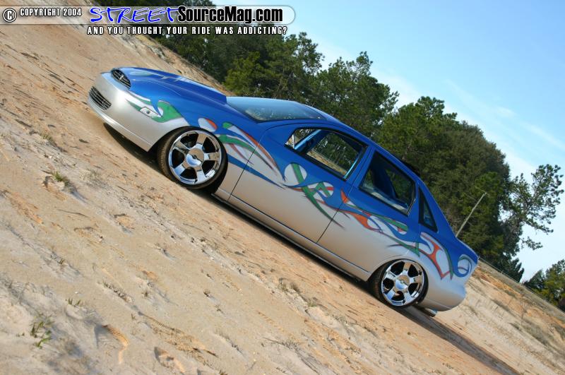 The seats and headliner are wrapped in Miami Suede with the seats being covered in blue and silver and the headliner being wrapped in blue. The suede was laid down by Gary’s Auto Trim in Georgia. The door panels and a panel on the trunk where glassed and then graphed out. Focus Central AC billet knobs set the dash off.