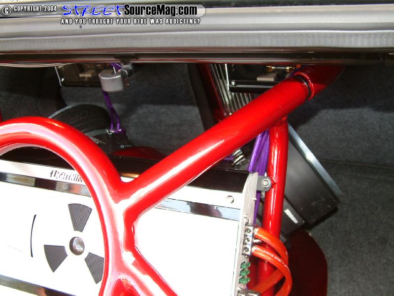 Continuing inside Kurt would install a one off custom Roll bar made from 1-1/2inch mild steel and powder coated candy red. The new roll cage would be used to help house some stereo components. To help play the music of choice Kurt would install a Rockford Fosgate CD player while a Lightning Audio EQ helps adjust the sound to perfection.