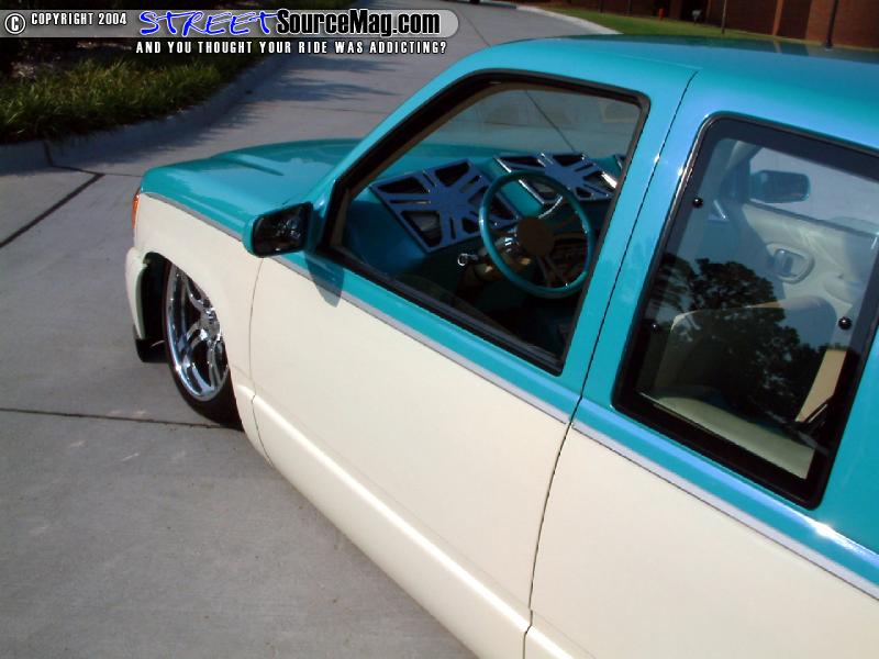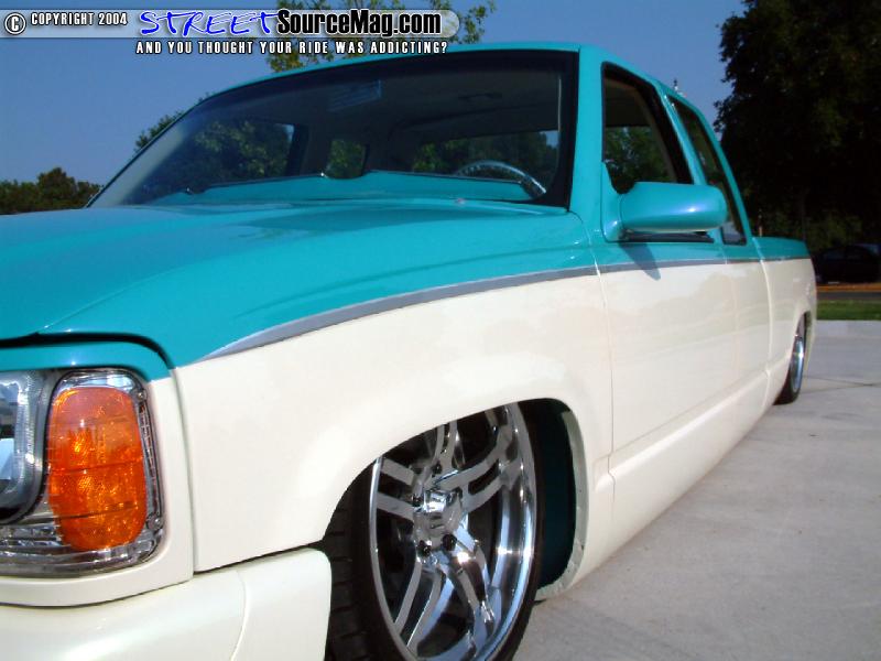 Working over the exterior Mitch would bolt up all new products upfront. For starters a GM hood would take the place of the stock Chevy hood. Next Mitch would install a Denali grille with having modified openings to his liking. The front finders would then be swapped out with a set of Denali fenders with shaved flare holes and with radiused edges. The installation of a GMC Sierra bumper and Denali headlights would help finish up the front transformation.