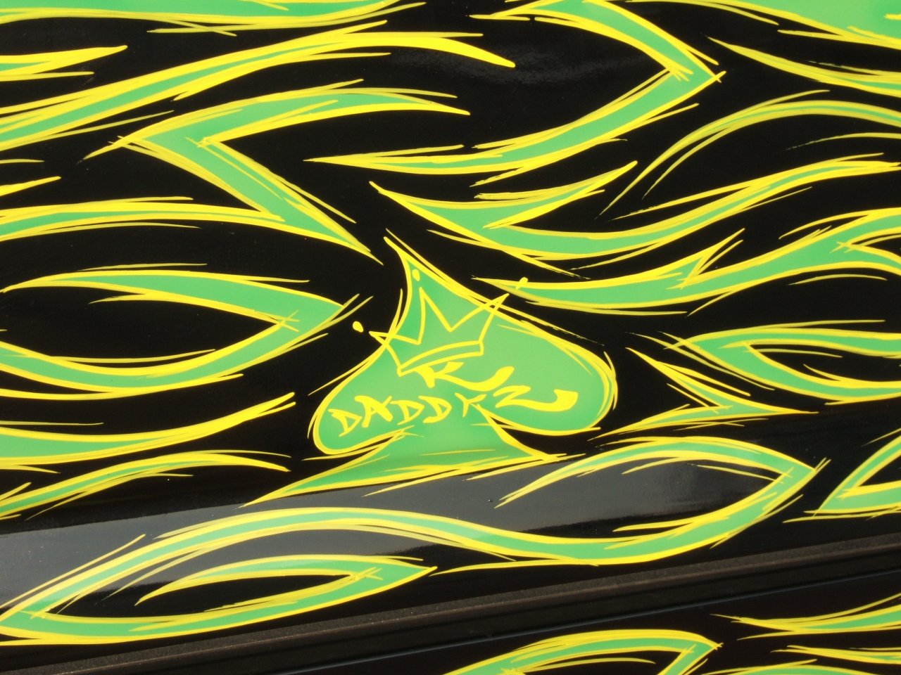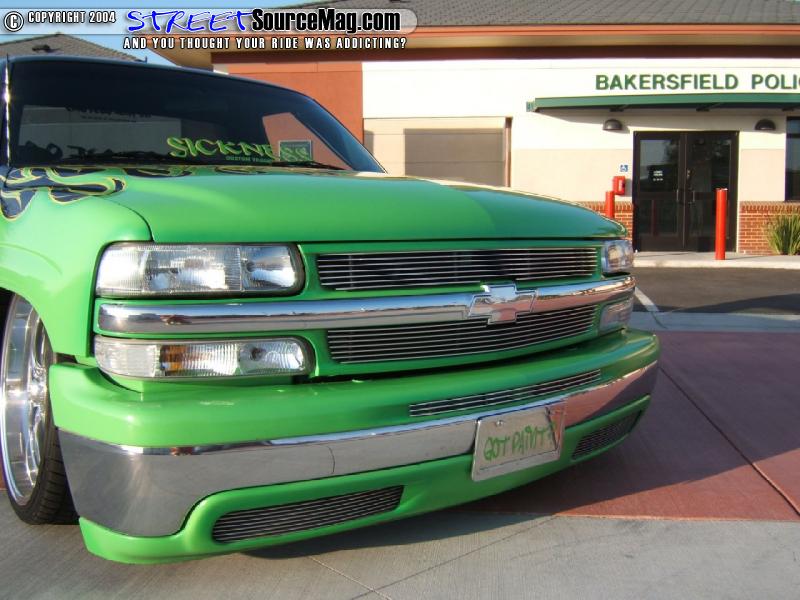 The first thing that draws your attention is the awesome tribal flame paint job that covers every inch of the exterior. All using House of Kolor paints, Kyle from world famous K-Daddyz Kustoms in Bakersfield, Ca., takes the honors for this marvelous piece of rolling machinery.   With pride, he leaves his signature on the tailgate of the truck which just completes the custom job.
