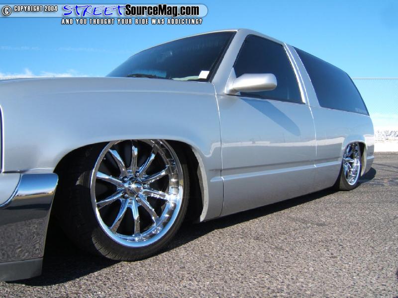 Tahoe’s are notorious for their huge frame rails, and those would not cut it for Dan’s Hoe. He started by doing a 2 in frame cut, which is why Dan’s Hoe looks lower than most, and boxing the whole frame then added a large step notch. He then lifted the gas tank 4 inches and section the tank 3 inches to keep it out of view. He then fully bagged the truck so it would lay frame rails all the way around on the set of 20x8.5 Weld Evo Axis wheels with 255/35/20 rubber that Dan had mounted up to his ride.