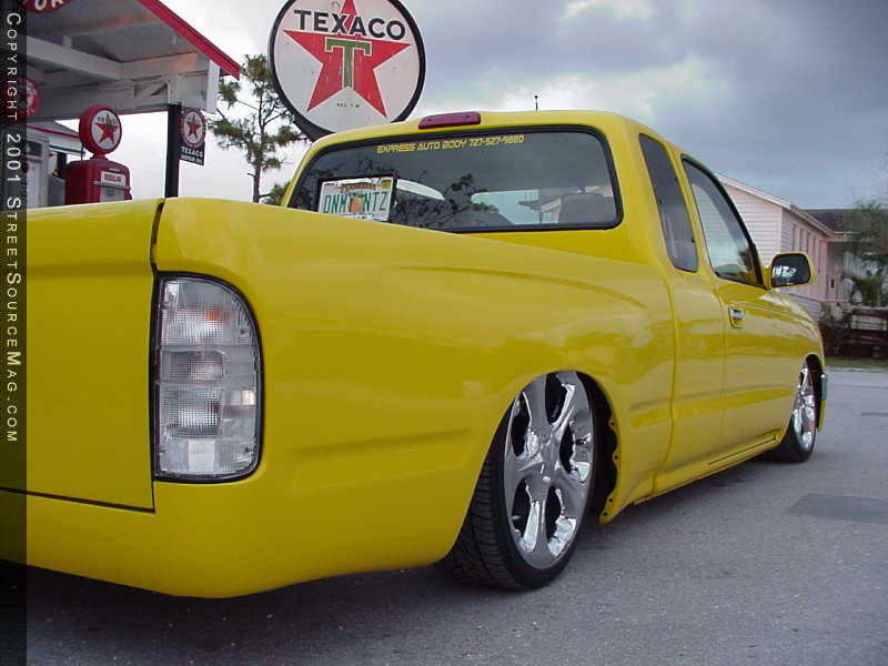 The owner and Express Auto Body again were responsible for the flames. Finally, to wrap out the exterior of Stephen's Taco, clear taillights were installed as well as a lexan rear window, complete with frenched license plate box. Stephen's Taco had started to take shape, but the owner knew he wanted it to lay terra firma. To accomplish this, he called the crew at Draggin Azz Customs in St. Petersburg, Florida to perform the necessary work to lay his Taco out. First, Draggin Azz performed a super step notch that would allow the rear of Stephen's Taco to fully lay out.