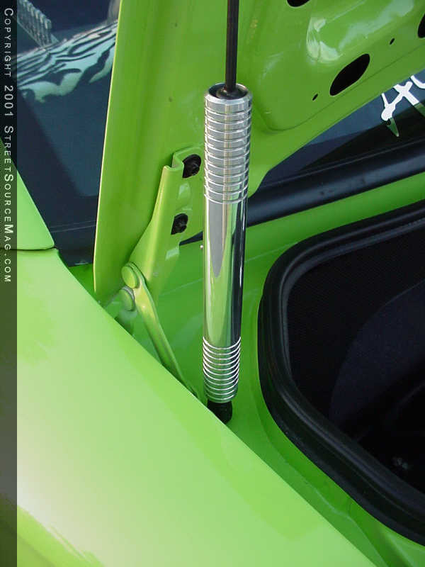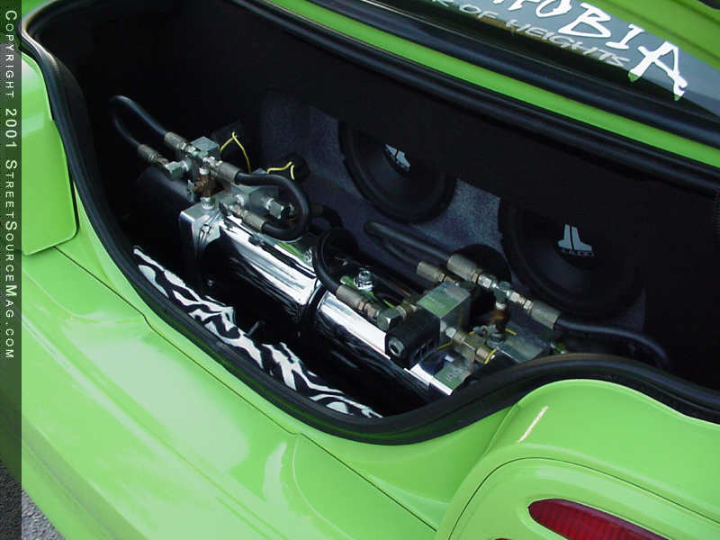 Billet & Acrylic Accessories in Vero Beach, Florida created many of the billet accents that can be found inside and out on Jay's Mustang. They custom made many of the billet parts and pieces found on Jay's Mustang, including the "Ford" billet gas cap.  For listening pleasures, Jay dropped his Mustang off at HiWay Hifi in Melbourne, Florida for a custom stereo install that not only sounds good, but also compliments the overall appearance of his ride. In the trunk, a Plexiglas box houses two JL Audio 10w6's, which are powered by a Rockford Fosgate 200 IX amp.