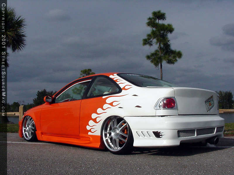 The crew at Fitzpatrick's also shaved the door handles and smoothed the front fenders and hood. In the front of Nathan's Civic you'll also find a Wings West bumper and custom headlights as well as a rear bumper from Wings West.   After the final sanding and prep work was complete, Fitzpatrick's sprayed the car white, then added a truly one-off House Of Kolor Tangelo Orange Pearl across the front of Nathan's Civic, which breaks into a flame-style graphic, separating the two colors.