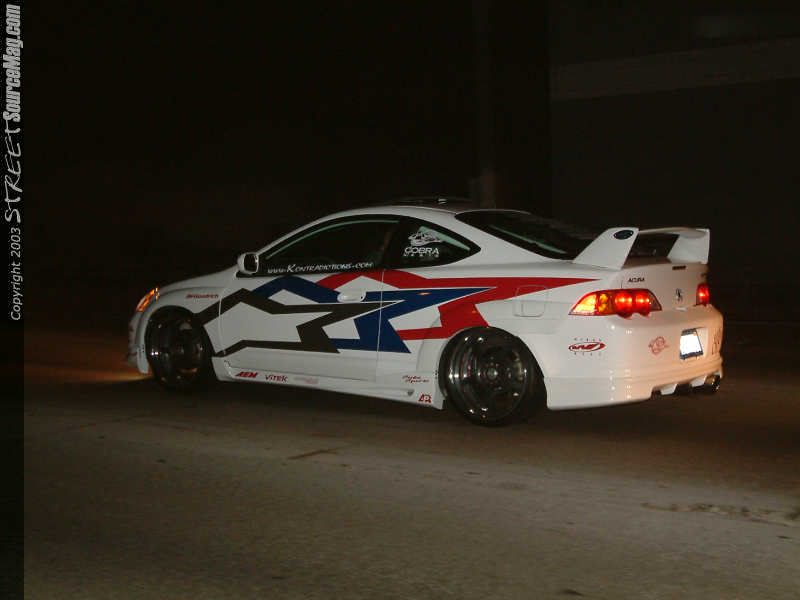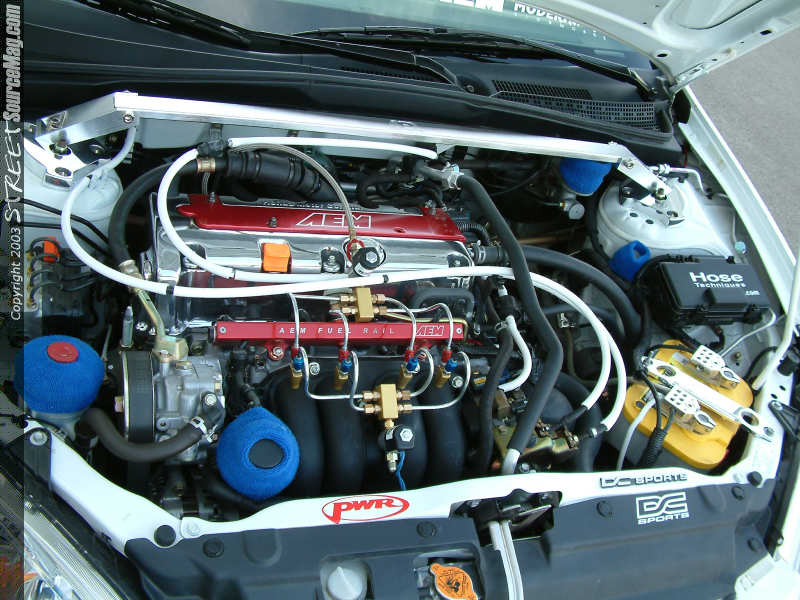 With the already quick 2.0L K20A implant it wouldn't take much to make things quicker and grab attention through not only the streets but at the show scene. For beginners Darron would install an AEM fuel rail, spark plug cover and a AEM cold air intake. Next a DC Sports 4 to 1 header would be bolted up to the block and the 2.25 Magnaflow stainless cat back system to help the engine breath a little easier.
