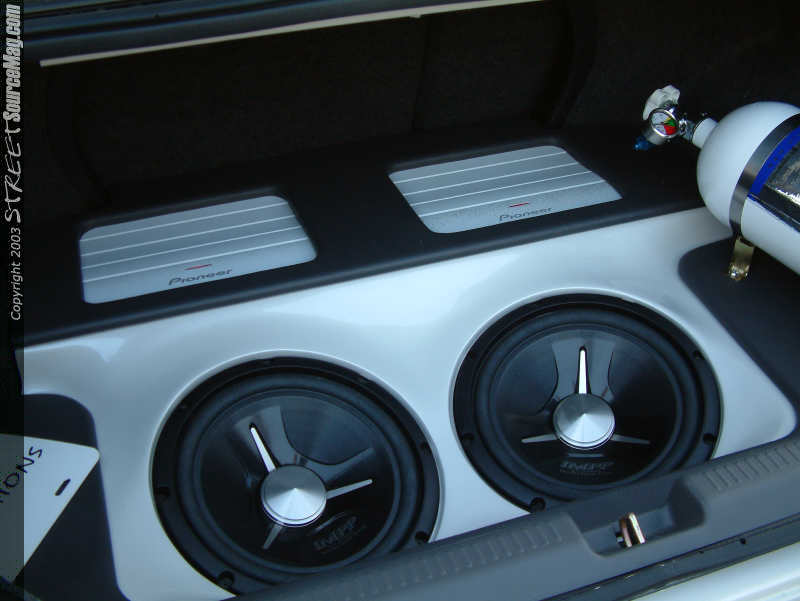The rear deck was done in black and gray suede material with 6.5's and tweeters in the deck stock location. You can also find 2 12-inch Pioneer subs fiber-glassed in the along with a set of 2 channel and 4 channel Pioneer amplifiers.   Finishing things off inside you will find a Pioneer CD/TV/Tuner wired by Scosche, while Audio Options performed the trunk work.