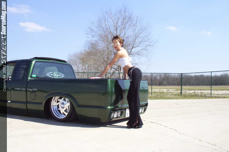 First the door handles, stock mirrors, tailgate handle, taillights and antenna would have to be history. Next the antenna would have be relocated and frenched into the passenger's side of the C pillar. Once all the bodywork was complete Ryan laid down several coats of factory Chevy Fairway Green paint and topped that off with generous amounts of the clear stuff.  With the paint shining it was then time to finish the exterior of the dime. Troy added a 97 Chevy S-10 chrome grill shell with a phantom billet grill hiding the HID conversion headlights neatly behind it.