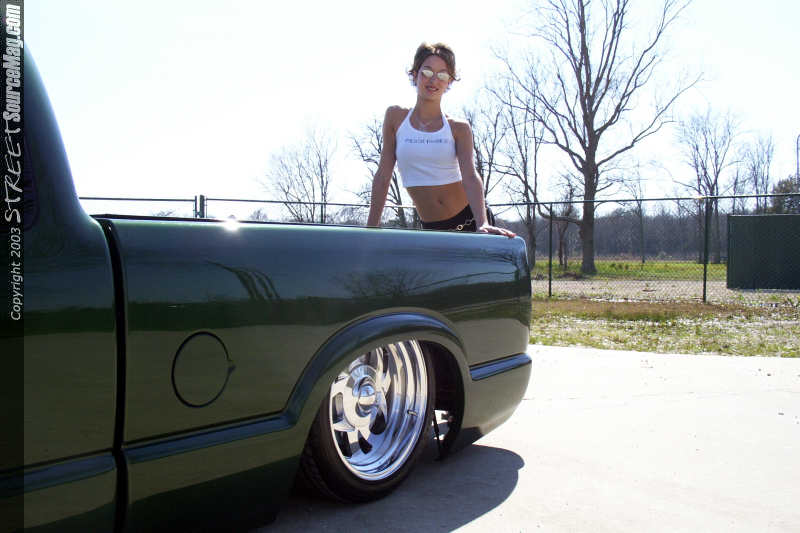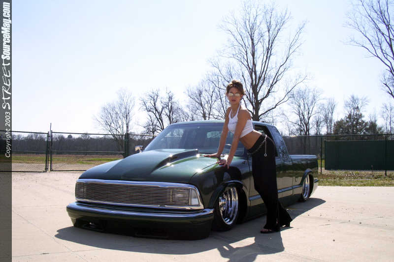 Next Damion swapped the roll pan that was previously installed for a Sophie roll pan with a clear taillight combo. To finish off the bed area Damion wrapped the bed area in a custom carpet kit. To make a few more ponies out of the 4.3 V6 a Ractive air intake system was installed and a Power Programmer was used to reprogram the computer to add the go fast appeal of the dime. To get rid of spent gasses a two chamber Flow-Master was then installed. To finish off the engine area assorted billet accessories were then installed under the hood. Now Damion had the show winning combination he wanted to achieve. Damion has shown his dime at such shows at New Orleans World of Wheels, Showfest, Lake Front Tour, Mardi Gras Nationals and several local events, taking home trophies at each to prove that this is not just another S-10. You can expect to see more of this ultra clean dime this next show season all over the south. There is no way Damion could forget to thank his wife Heidi who has put up with his costly obsession and past projects. Damion would also like to thank his club Envious Styles for all their support and hard work to make this truck happen. At a price tag of over 20g's to build this truck will make anyone Green with Envy.