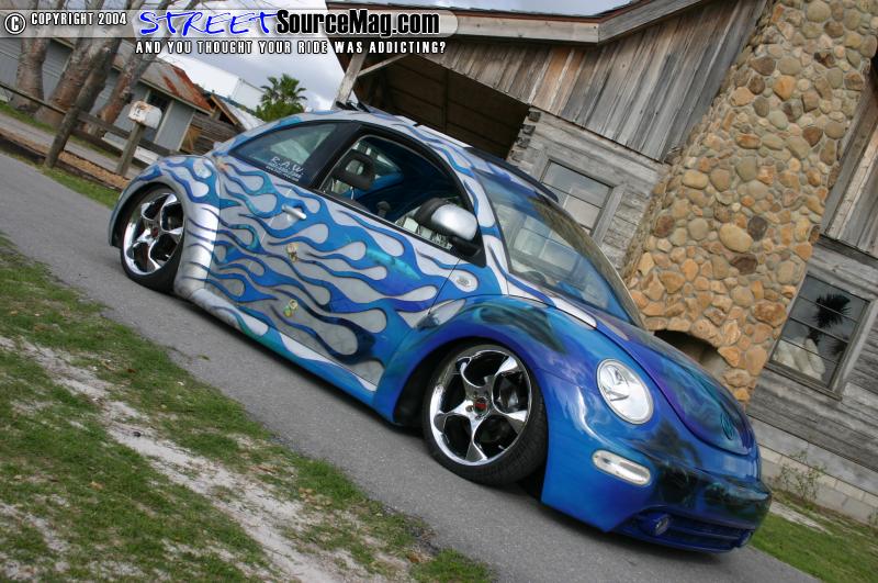 The main basecoat would be Silver with a fish scale overlay and topped with a rainbow pearl. To help set it off the crew from R.A.W. would then throw on top a set of blue flames with a teal pearl and a airbrushed theme through out the vehicle and accompanied by various characters such as "where's Waldo", the bud lizards, turtle love and much more found in every nook and cranny.