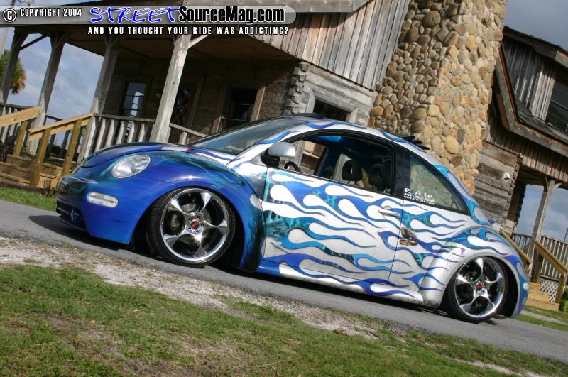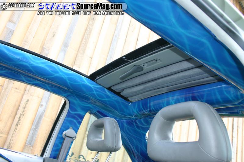 To bring the interior and exterior together with the custom paint and graphics going in through the door jams, Selena would have some fiberglassing work done to some interior panels and the same paint scheme applied within along with a new water feel. The dash piece found over the white faced gauges along with custom door panel pieces would be painted with the same fish scale idea and blue flames followed through to the back-side panels.