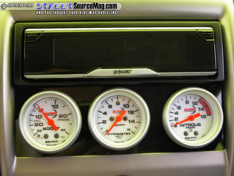 Next Victor turned his wicked grin towards the interior and continued laughing like a mad man. A complete set of Autometer Lunar gauges including a 5" tach with a carbon fiber cup, chrome extinguisher, boost, a/f ratio, exhaust gas temperature, voltage, oil pressure, and NOS pressure were established to monitor the heartbeat of this Protege.