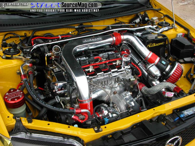Trick it all up with polished intake pipes, a custom HiBoost turbo manifold polished and ceramic coated by Performance Coatings in Arlington, Texas, steel braided hoses, and an Apex-1 N1 exhaust system. Oh yea, then there's the chrome coolant catch can, the Injen aluminum oil cap, the Top Speed air filter, the MazdaSpeed JDM radiator cap, the chrome strut bar, and the Nokya red engine dress up kit.