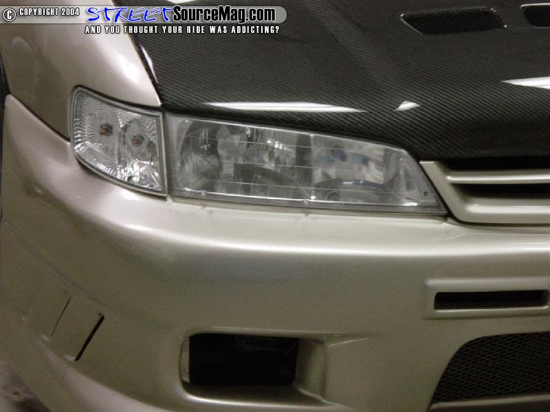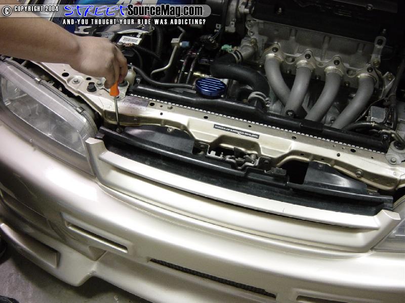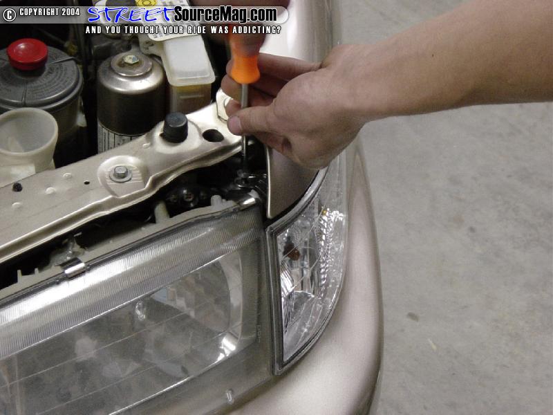 Next remove the Phillips head on top of each of the corner lights and pull it forward to release the pressure clips on the back of the lights. Now remove the Phillips head screws that are between the headlights. (This is where the stock bumper will vary from these pics. This car had 3 screws holding the center on.)