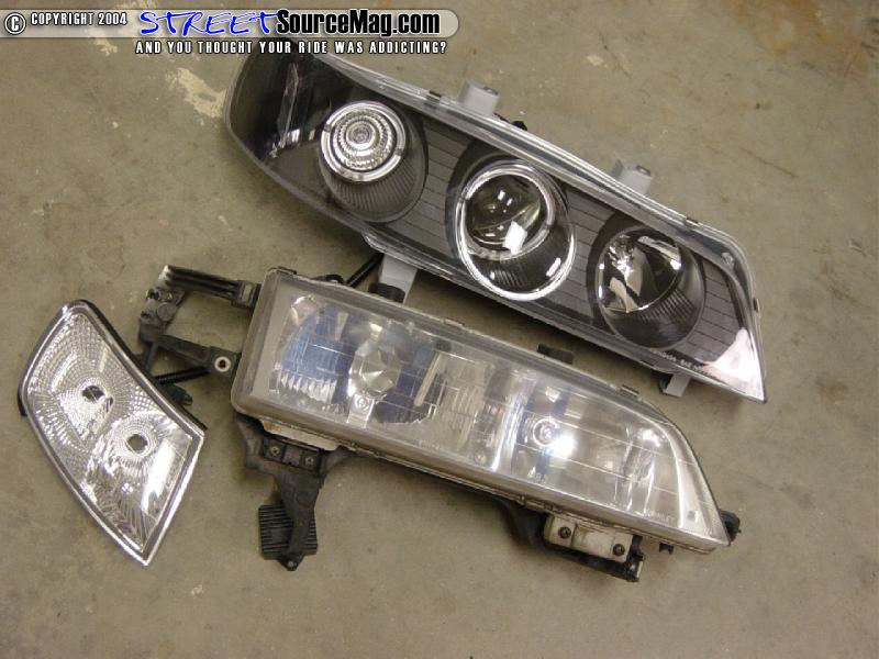 Once the front crush panel is removed, you can simply unplug all the bulbs and pull the factory headlight forward to remove it. This leaves plenty of room for the new light to be installed. This is the comparison of the stock 2-piece set up and the new one-piece set up. Notice how the stock headlight will turn dull after a few years of use; the new lights will also clean up the front end as well. Now that you have removed everything and have both lights out, it is time to reverse all the previous steps and install the new lights. With these particular lights, you will only have 4 bolts to reinstall each light instead of 5. The new lights will simply need to be pushed in with the guide pins where the corner lights used to be and re-bolted. Here is what the final look will be. Something as simple and cheap as changing out your headlights can make all the difference in the world.