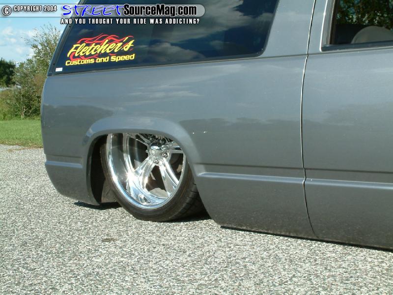 The crew at Fletchers would then custom modify the stock control arms ensuring clearance all around. Ensuring enough room under the beast, a 20-gallon aluminum gas tank would take the place of the stock bulky tank adding more room for low. A set of Monroe shocks and Slam Specialties RS72 bags would then be placed at all 4 corners for adjustability. For a cleaner look stainless brake lines would then be ran through out.