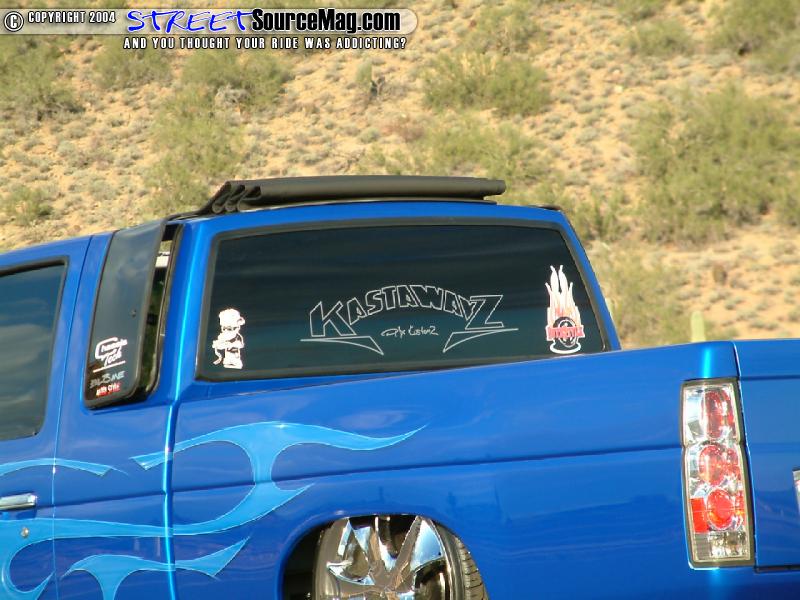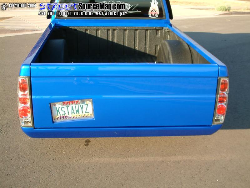 Continuing the body mods, the 3rd brake light, tailgate handle, emblems, squirters and cowl would all be shaved while the rear license plate would be frenched into place. Finishing off the exterior mods Jerry would install a 35x42 electric sliding rag.