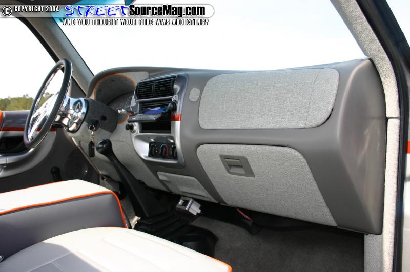 The seats were custom fabricated by Ken. What he did was create a custom low back seat with the top half being Escort seats, and the bottom half being Ranger seats. The seats where then wrapped by Larry’s Trim in carbon fiber silver, gator shine leather, gray vinyl, and finished off with orange piping. The steering wheel was replaced with a Billet Specialties billet wheel, and the mirror was replaced with a billet-milled mirror. A Kenwood head unit, Rockford Fostgate subs, and Blaupunkt mids and tweets provide the sound. Audiobahn and Blaupunkt amps power the system.