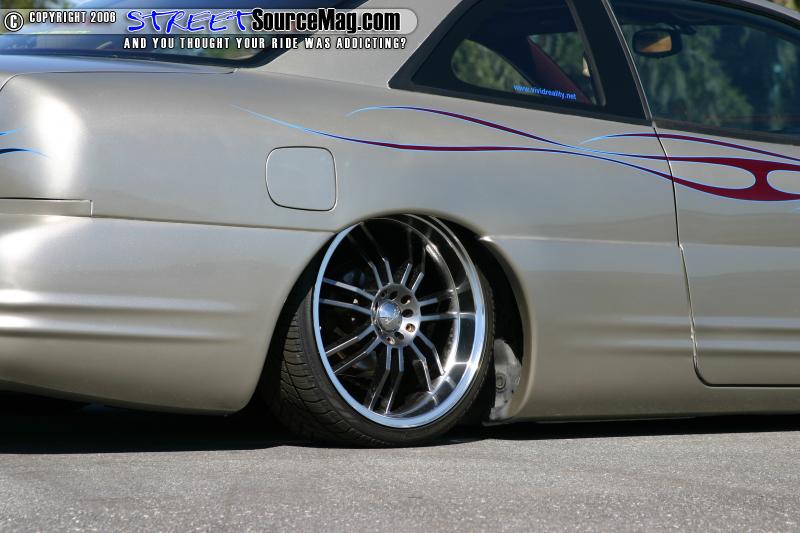 Fleet’s Sebring wouldn’t get very far at any show with its stock stance so a 2 pump Showtime hydro setup was installed with 4 accumulators, 10 switch’s, and 4 yellow top battery’s. All of the hydro lines were hard lined. To get the car to lay a little lower the front spindles were shortened, custom upper and lower control arms were built for the rear, and Toyota spindles were installed in the rear.