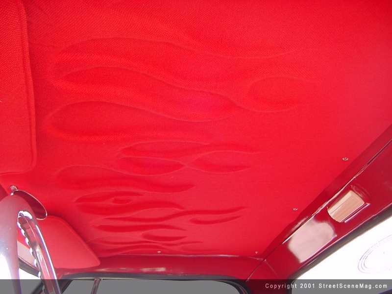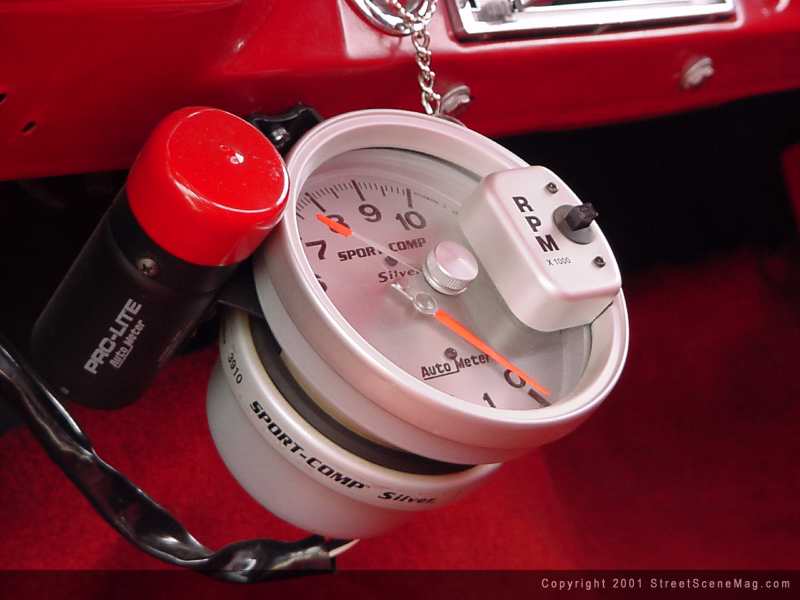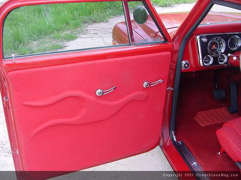 The next step of course, would be to have the seats recovered. The decision that the black interior would be to hot for the summer, the choice was to go with red tweed in it's place. In reworking the interior, Jim managed to not leave out any panel while working the door panels, dash and headliner.   To help bring a much-added custom look to the interior, Jim bolted up all of the billet stuff made for this truck along with an Autometer monster tachometer.