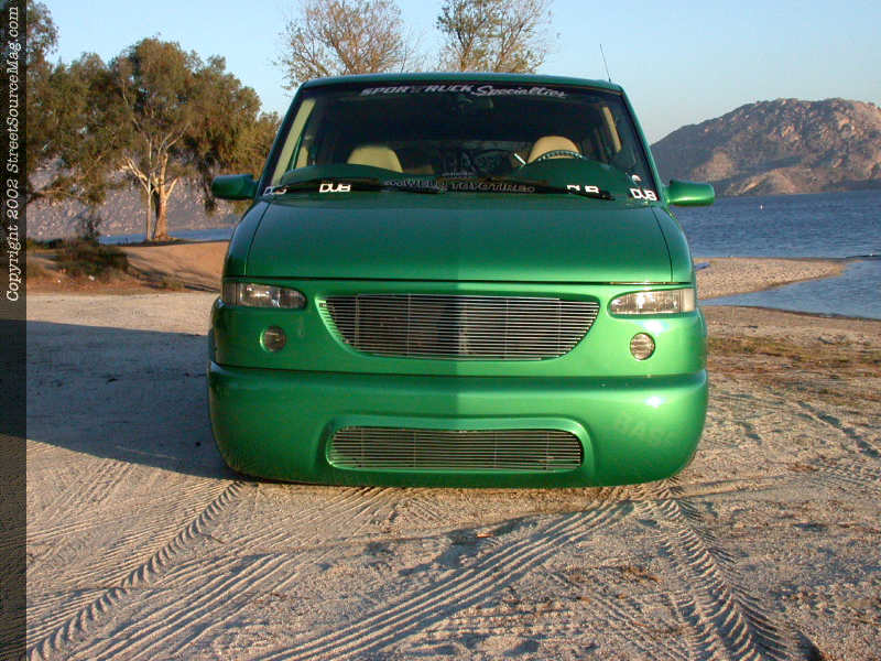 To bring vision out during the night, a set of PIAA lights mounted into the front bumper would help the stock headlight assembly. With the bodywork and new panels added and complete, it was time for Ernest to have the crew at Liberty Body Shop of Los Angeles to lay down the paint of chose. Utilizing BASF (RM) paint, the Van would be painted a 3AM green along with a set of ghost flames to help bring things alive. With the exterior complete it was time to work the suspension. With running a set of 20x8.5 Weld Racing Evo Axis 5 wheels wrapped in 245-35-20 Toyo Tire Proxes, it would take a nice suspension set up to bring the body kit down closer to the ground. Starting in the rear, the frame rails would be notched and boxed by Sport Truck Specialty of Carson, CA, leaving more room for rear travel.