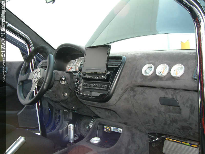 Not wanting to feel left out Daniel knew the interior would have to be as wild as the exterior so the Sparco SRD front seats, dash, door panels, headliner and many other panels were wrapped in Black suede leather by Apollo Interiors of Alhambra, CA.