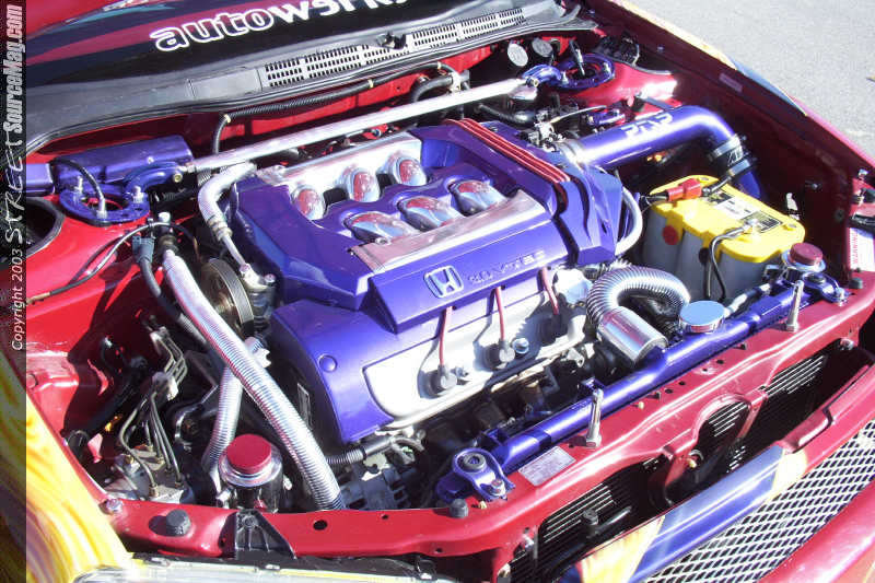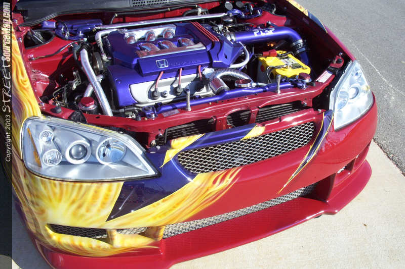 Turning his attention to the engine compartment Justin noticed it was lacking the same luster as the exterior and interior. So he polished the intake manifold, custom painted several items and then added an AEM cold air intake. To replace the nasty stock hoses, Cool Flex hoses were then added for coolant circulation functions. To ensure the proper fire power reached the motor a set of Magnecor plug wires were added. A Comptech header backed up by an all polished stainless steel 2 ½" exhaust with a polished cat and a pair of Greddy polished mufflers were added to ensure the Accord was not all show and no go.