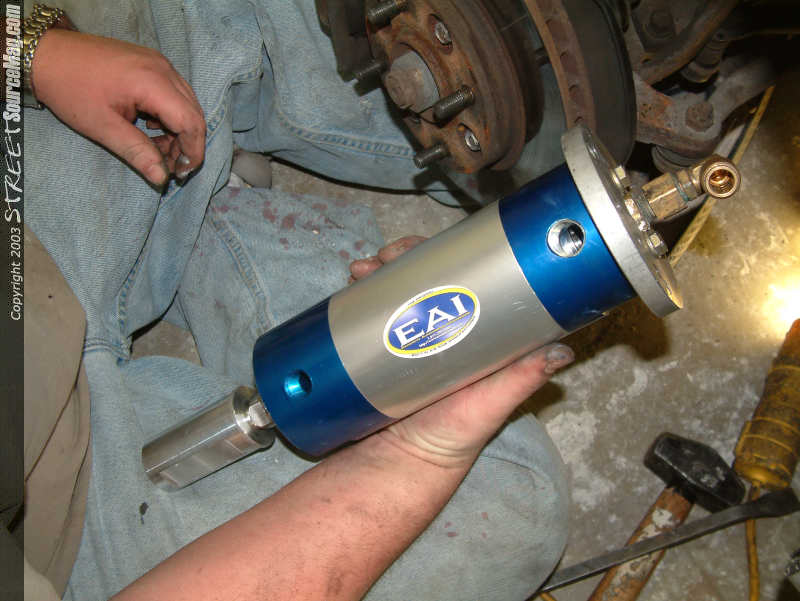 2. Since the front of the car is ready for its new suspension, it's time to assemble the new Parker air cylinders. First, install a small sir muffler to the bottom of the air cylinders. These will act as filters, keeping dirt and moisture out of the cylinder. (keeping these mufflers out is an option, and it will speed up the cylinders if you are looking for fast). The fork adapter simply screws onto the rod end of the cylinder. With the fork adapter in place, you will then bolt on the billet aluminum upper mounts (DO NOT OVER TIGHTEN BOLTS IN TO BILLET BRACKETS. IT MAY DAMAGE BRACKETS AND TOPS OF CYLINDERS.), and then attach the air fittings.