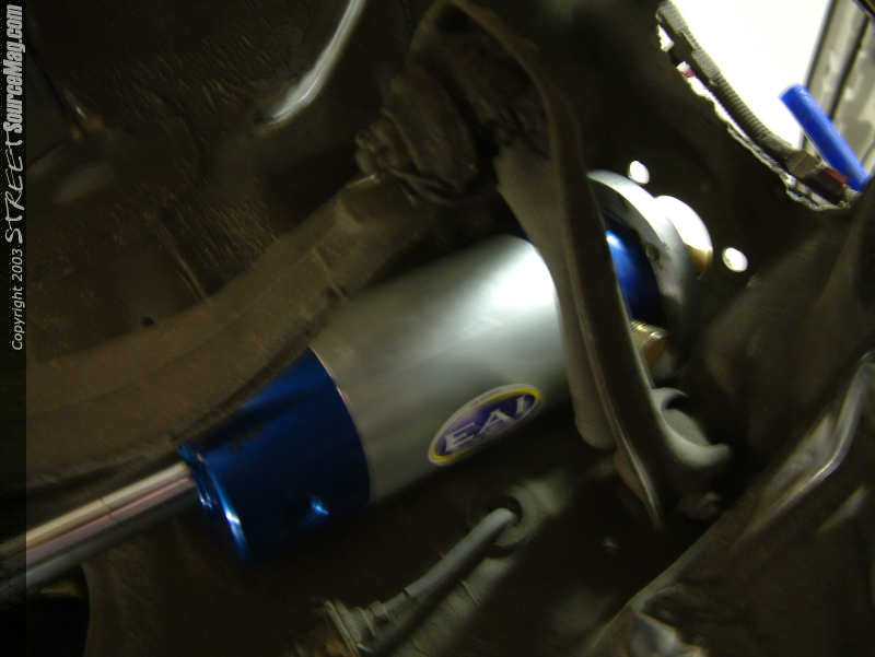 3. Bolt the air cylinders to the upper strut mounts using the provided hardware. Don't forget to install the new urethane bushings; if you miss this step the ride will not be so enjoyable. Next, slip the forks onto the new lower adapters and use the factory bolts to permanently attach them. Make sure to use a floor jack to raise the lower control arms to meet the forks, and then reinstall the factory bolts to finish the front air cylinder installation.