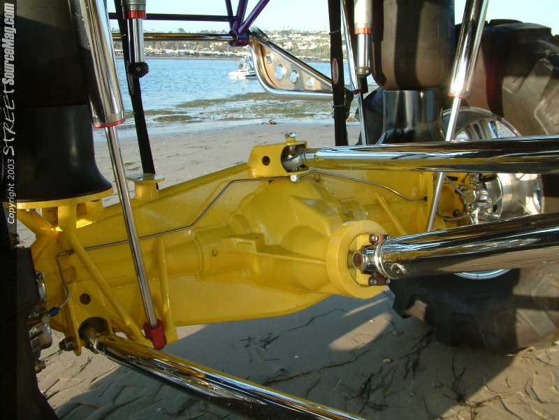 The cage also provides the mounting locations for the chrome-plated "The Edge" Donahoe Racing Enterprises link bars with 1-ΒΌ heim joints. The front is equipped with a triangulated four-link and the rear is fitted with a triangulated two-link system. There was even enough room left over for the 4 Optima yellow top batteries to straddle the transfer case.