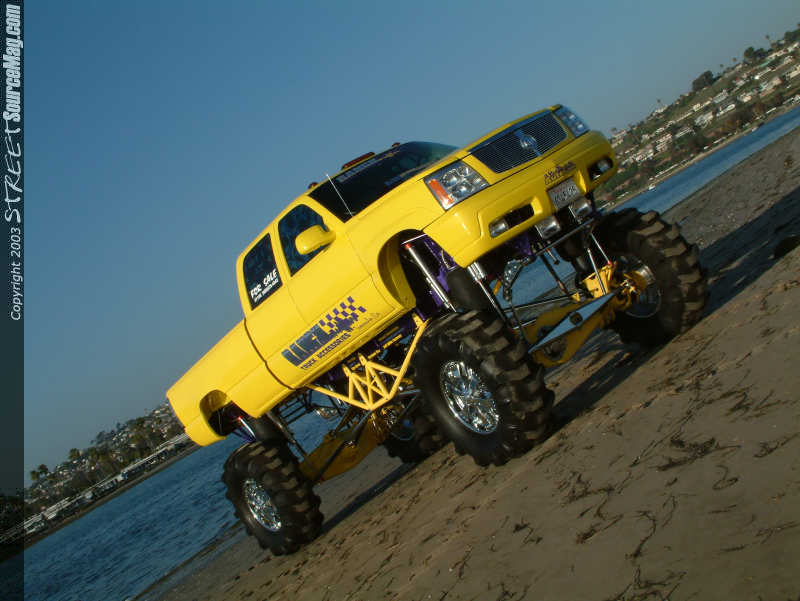 Next the Chevy would be painted a PPG Monster yellow along with Passion purple paint. Jeff Miller from JM Customs of Temecula, CA would be responsible for painting the truck along with the frame rails. To complete the exterior, Line X of Temecula, CA would be called in to spray the bed and speaker box lining.