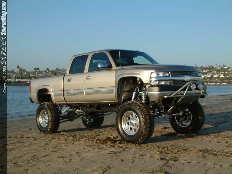 With purchasing his all new Chevy 2599 HD for $32,000 back on April 11th of 2001 along with dishing out another $50,000 into the build up, it would take 1 year to build and would be found complete on June 15th of 2002. The reason Adam decided to build this ride was as a shop vehicle showing off their skills. Adam has previously built an 85 Blazer and a '84 1500 but felt that this would be his pride. After became involved in the scene when he opened up his shop 12 years ago, the skills are found better as the years go on. Adam's decision to keep things simple would pay off. Starting upfront a Billet Stoll grille would be installed along with Pewter painted brush guard and chromed out cover. In the guard you will find a set of lights mounted up for those late night 4x4 adventures. Next the stock front fenders would be thrown to the side and a set of Glass Works Fiber fenders, with a Pre-runner look would be bolted in their place. The stock door handles would then be removed and a set off of an Escalade would be found bolted in along with a set of 2003 Chevy taillights in the rear.  | Everything with this truck is very clean, not even a spot of dirt in the wheel wells! |