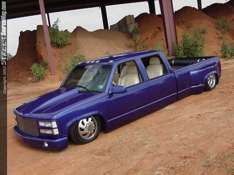 Moving back, the door handles would be shaved on all 4 doors along with welding in a Chassis Tech roll pan and molding in the tailgate. A hard shell bed cover would be installed to finish things off out back.   With the body work complete and the prep work done, the Dually was taken to Norman Body works of Norman, OK. While in their hands, they would lay down the Acura Supersonic blue paint.