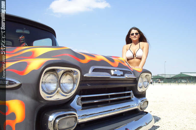 Billy started the project by finding the cab and front clip of a completely wore out 59' Apache. Ok so I know your asking why only the cab and clip. Well if you'll hold your horses I'll tell yeah. See Billy only needed the cab and front clip because that was all he planned to use of it. Billy took the frame, motor, suspension, bed and part of the interior of a 1988 Chevy ½ ton donor truck to use in a perfect mix with the 59's cab and front clip. Billy took the 59' cab and placed it on the 88' frame reworking the cab mounts to accept the Apache cab. Once the cab was firmly set on its new foundation it was then time to move attentions to the rear of the truck. Billy once again pulled out all the stops and added an 88' Chevy step-side bed, but to make sure that the bed fit correctly it was turned over to the fiberglass skills of Tim Dupre of Houma, La. Tim cut, sectioned, shaped and reworked the bed until it fit perfectly behind the 59' cab. While Tim had his tools out he shaved the tailgate handle and molded in a new rollpan. Once the bed was permantly in place a set of 88' Altezza Euro clear taillights were then temporarily installed in the factory location to give it a new flair. To add style to the cab Tim shaved the vent glasses of the cab to loose the Farmer Brown look. Once the body was straight Billy knew it would be awhile before he was ready to lay down the final paint scheme so Billy asked Tim to prime the truck flat black.