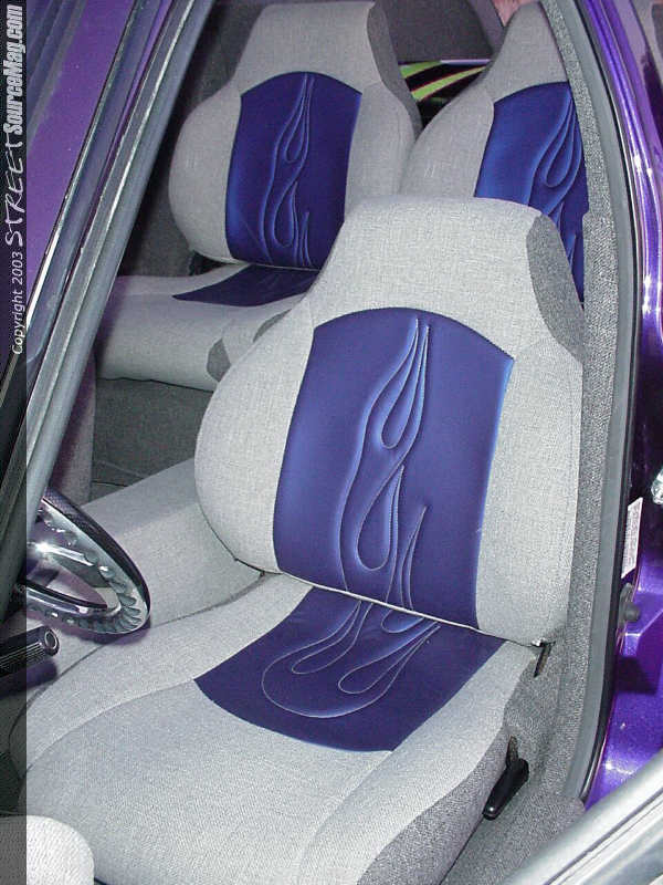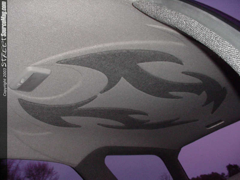 The dash also received matching tweed, complete with the Negative Camber logo stitched masterfully onto the top of the dash. The headliner also received custom graphics utilizing graphite and grey tweed. The door panels were removed and restitched using matching tweed as well as illumina purple inserts.