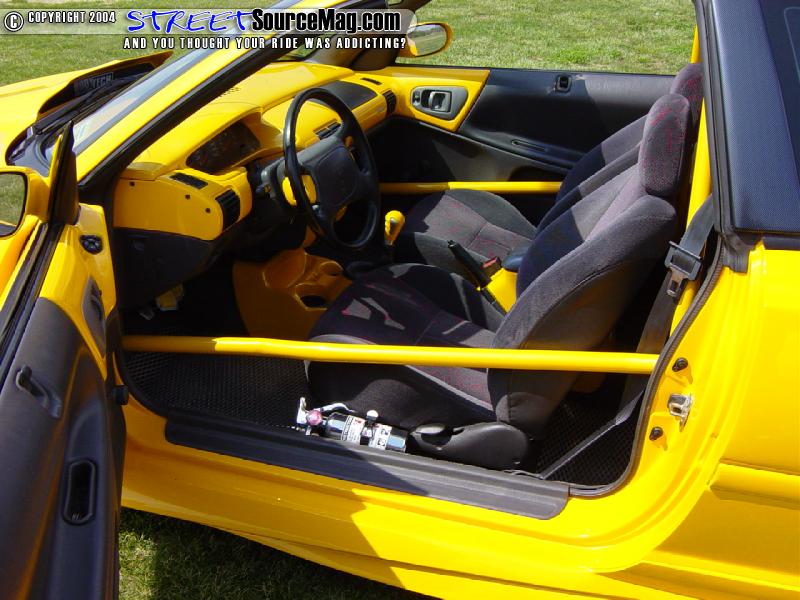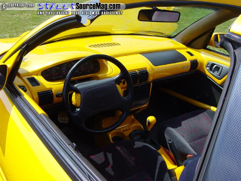 With an exterior like that, it was necessary to have an interior that wouldn't look out of place. Brandon pulled out the dash, center console and tops of the door panels and sanded them down smooth and sprayed the same yellow with gold pearl paint as the exterior.  He also had matching ghost flames sprayed on the top of the dash. Now for what makes this interior stand out is the full frame-to-frame roll bar.