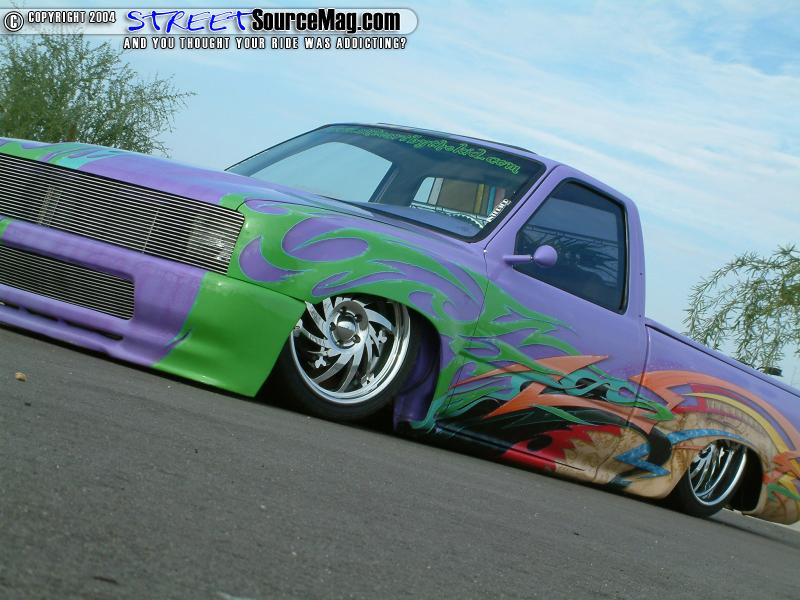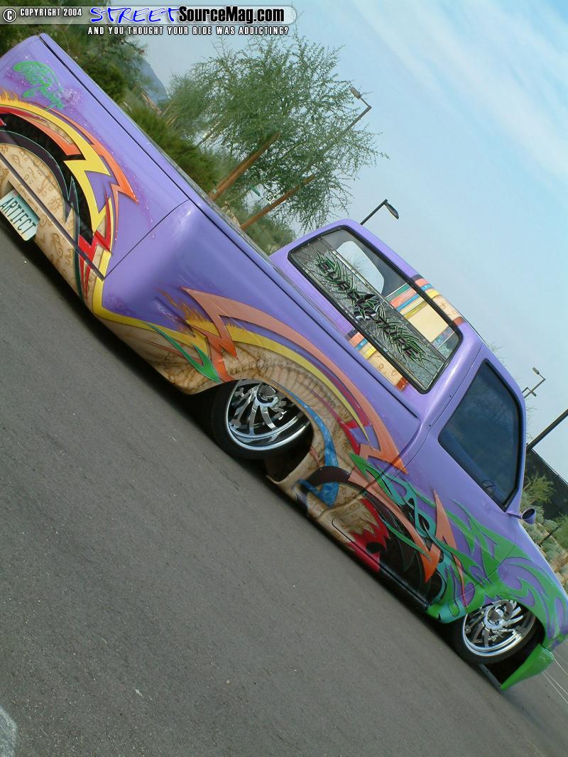 "My first guinea pig was a Nissan Hardbody that belonged to a friend. I got a whopping $60 for painting a sunset graphic down the bedsides and tailgate. At 19 I moved to OK where I got in with a local mini truck club (Lower Level) painting their logos, and the rest is history." As you can see Charles was brought up through the scene with one of the best and his talent truly shows through with every vehicle he touches.